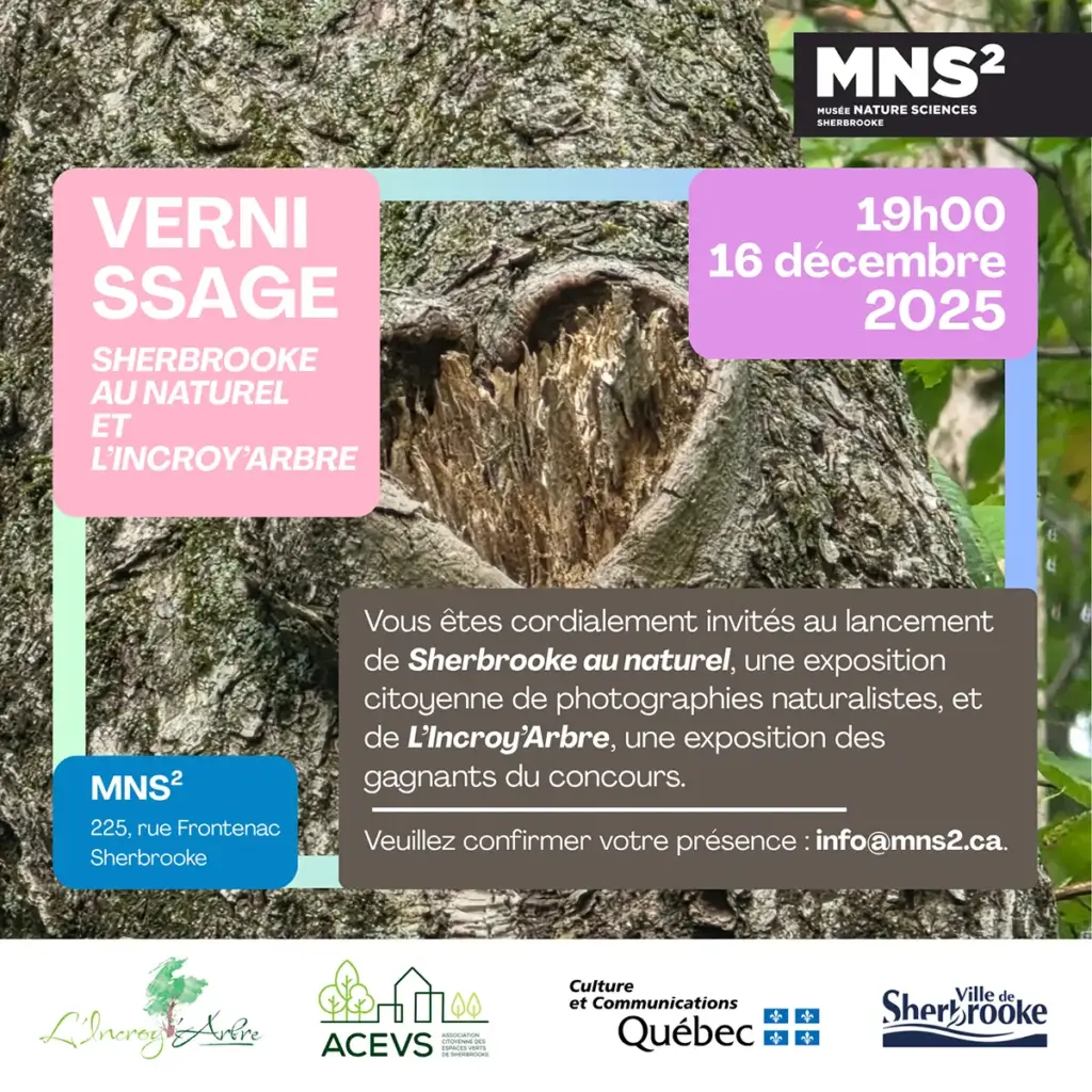 Le 16 décembre à 19 h, l’Association citoyenne des espaces verts de Sherbrooke (ACEVS) et le Musée de la nature et des sciences (225, rue Frontenac, Sherbrooke) inaugureront l’exposition des lauréats du concours L’Incroy’Arbre, qui met en valeur le patrimoine arboré urbain, ainsi que l’exposition citoyenne Sherbrooke au naturel, offrant un regard unique sur la nature sherbrookoise à travers des photographies naturalistes.